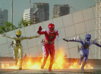 The three DinoThunder Rangers walk toward us as a bright explosion behind them fades into their three Dinozords, roaring in the city. |
