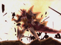 Thundersaurus Megazord spins its left armblade while flying with it forth amid explosions. |