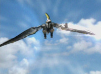 White Dragozord flies through the sky with its left wing glowing. |