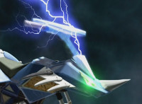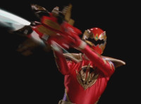 Left shot is from his morphing sequence; right shot is deleted footage; White Tyrannozord tail smashes into a lightning bolt between the two shots, causing the whole screen to fly apart as a transition to the next shot. |