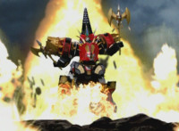 Thundersaurus Megazord spins its left armblade while flying with it forth amid explosions. |
