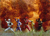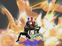 The three DinoThunder Rangers walk toward us as a bright explosion behind them fades into their three Dinozords, roaring in the city. |