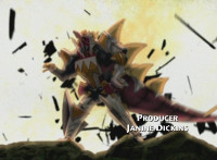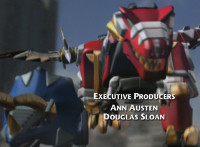 Tyrannozord walks in, roaring and firing beams from his mouth and tail, as the Power Rangers logo appears below him, followed by DinoThunder when he jabs his tail downward between the Power and Rangers turning it into a lightning bolt symbol. He roars again and the logo flies apart at us. |