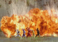 Left shot is a composite of US posing footage (from the morphing sequence) with unrelated Aba background; right shot is deleted footage; Black Tyrannozord tail smashes into a lightning bolt between the two shots, causing the whole screen to fly apart as a transition to the next shot. |