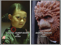 Mora's shot is mirror-flipped; Piggy's shot is unused footage. |