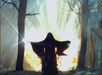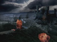 The black-cloaked Udonna spreads her arms as an explosion erupts behind her. |