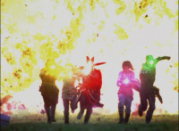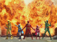 The five Mystic Rangers pose in front of a series of explosions near a warehouse. |