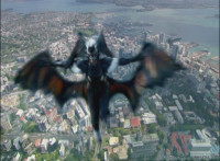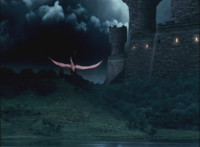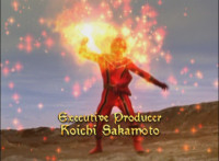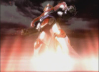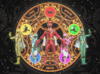 Centaurus Phoenix Megazord stands completed in front of a flaming seal. |