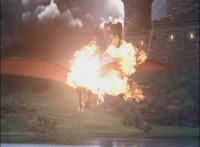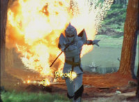 Koragg in Centaur Megazord mode marches through the forest as flame bursts erupt around him. |