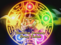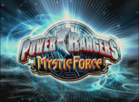 Breaking out of a stone against a teal seal, the Power Rangers Mystic Force logo appears. |