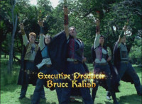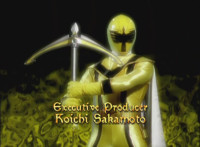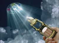 The five Mystic Rangers raise their glowing Magi Staffs up while sitting in their cockpit. Titan Megazord readies its saber, then slashes it forth through a golden seal. |