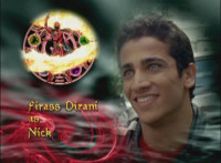 On the left, Red poses amid swirling flames in front of a red seal / on the right, Nick smiles. |