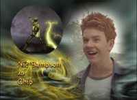 On the left, Yellow poses in front of a stormy sky with yellow lightning / on the right, Chip smiles excitedly. |