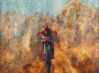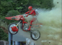 Red leaps his Mystic Speeder through a cloud of dust. |