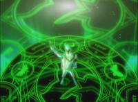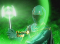 Green holds up his green glowing Magi Staff in Axe Mode. |