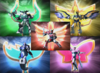 Green, Pink, Blue, Yellow, Red rise up and turn into Mystic Titans. |