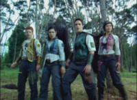 The five Mystic teens raise their Mystic Morphers skyward. |