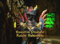 Extra-giant Jenji spreads his arms, revealing Titan Megazord was between his paws, as they float forth and slash their Saber at us. |