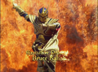 Red leaps up, charges his saber with a seal representing all five Rangers, and flamey-energy-slashes forth. |