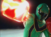 The five Mystic Rangers, and Solaris Knight, pose in front of a series of explosions near a warehouse, each with their personal weapon in hand. |