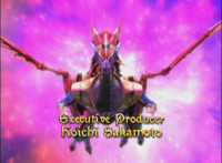 Extra-giant Jenji spreads his arms, revealing Titan Megazord was between his paws, as they float forth and slash their Saber at us. |