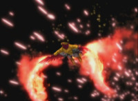Centaurus Phoenix Megazord stands completed in front of a flaming seal. |