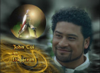 On the left, Solaris Knight poses with golden sparkles / on the right, Daggeron glances from right to left and smiles. |
