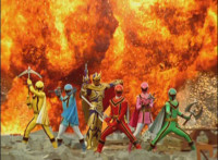 The five Mystic Rangers, and Solaris Knight, pose in front of a series of explosions near a warehouse, each with their personal weapon in hand. |