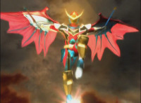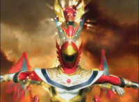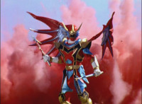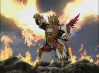 Centaurus Phoenix Megazord stands completed in front of a flaming seal. |