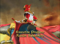 Extra-giant Jenji spreads his arms, revealing Titan Megazord was between his paws, as they float forth and slash their Saber at us. |
