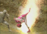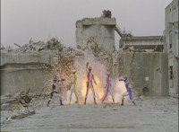 ![]() ![]() The five Rangers stand posed as explosions erupt around them amid cement ruins. |
