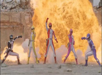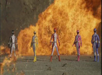 ![]() The five Overdrive Rangers stand stoicly as explosions erupt around them. |
