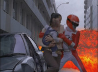 ![]() Red calmly aids an Asian mother and infant in vacating a car as lava pours down the street behind them. |