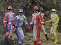 ![]() The five Rangers stand on rocky ground as they look to our slight left together, Blue standing up. |