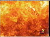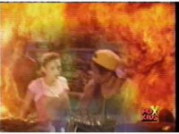 Close on Yellow Ranger, looking high upward our left, after stepping forth with wide gestures, while flames are on bottom of screen. |