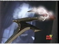 Lord Zedd's Z-shaped staff tip fires white electricity from its surface, lightning flashing about. |
