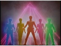The five Zeo Rangers stand in silhouette against a smokey backdrop, where soon a pink glowing tetrahedron appears, prompting the Rangers to start glowing their respective colors. |