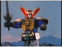 Close-up on Zeo Megazord's head as the Zeozord Five Battle Helmet slides down over it, flashing happening just off-frame. |
