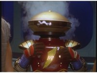 Close on Alpha 5, as he writhes, smoking and electricity crackling across his visor. |