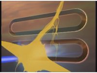 Beam fires across against block of energy, carving, to the right of the oval symbol, a pair of parallel bars. |