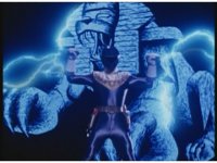 King Mondo steps forth to our slight right, talking in front of Earth cut-out. |