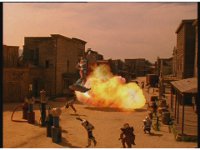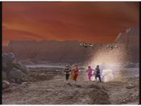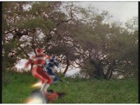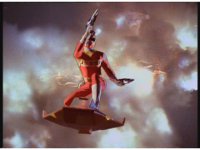 As pair of Velocifighters explodes behind him, Red surfs forth on his Galaxy Glider. |