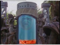 Piranahtrons cover Zordon's energy tube with a Divatox-branded shroud. |