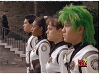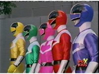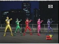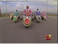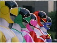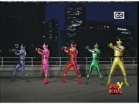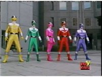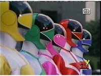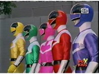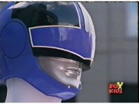 The Time Force Rangers stand around, then we see close-up beauty shots of their helmets. |