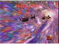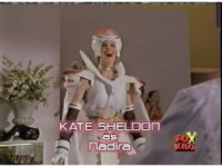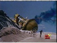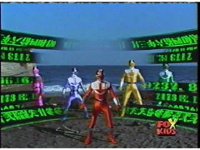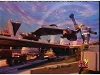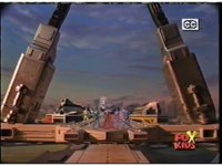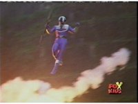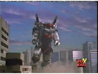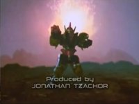 Time Force Megazord Mode Blue and Jetara fire on each other in bullet time. |