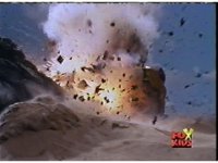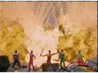Zoom out as Quantasaurus Megazord poses in front of an explosion. |