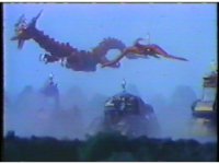 Red Dragon Thunderzord Warrior Mode swoops down, staff spinning, ends gleaming with power, slashing it past the screen when he gets very close, as background shimmers. |