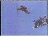 Side angle on Black finishing his leap from our right over four-wheeler, as Pink leaps in past another. |