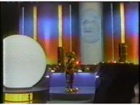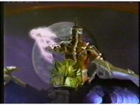 Backs to us, Goldar stands behind Lord Zedd, as he holds staff toward Earth cut-out, firing electricity forth. |