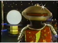 Close on Robogoat, clutching chest plate and holding red baton outward as he turns from our left, forward. |